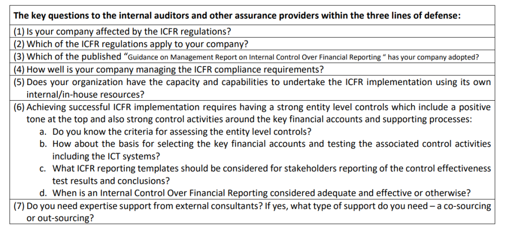 Given that the compliance requirements for internal control over financial reporting is focused on the financial controls around the financial transactions processing and reporting processes, it is very important to note that adopting a big picture approach in the ICFR implementation by embedding a robust Agile Risk Based Enterprise Risk Management (ERM) Framework For assessing risk exposures, developing risk responses and adopting strong Combined Assurance Strategy for testing control activities enterprise wide provide a great advantage to the organizations in making the certification requirements on the credibility of their financial statements.