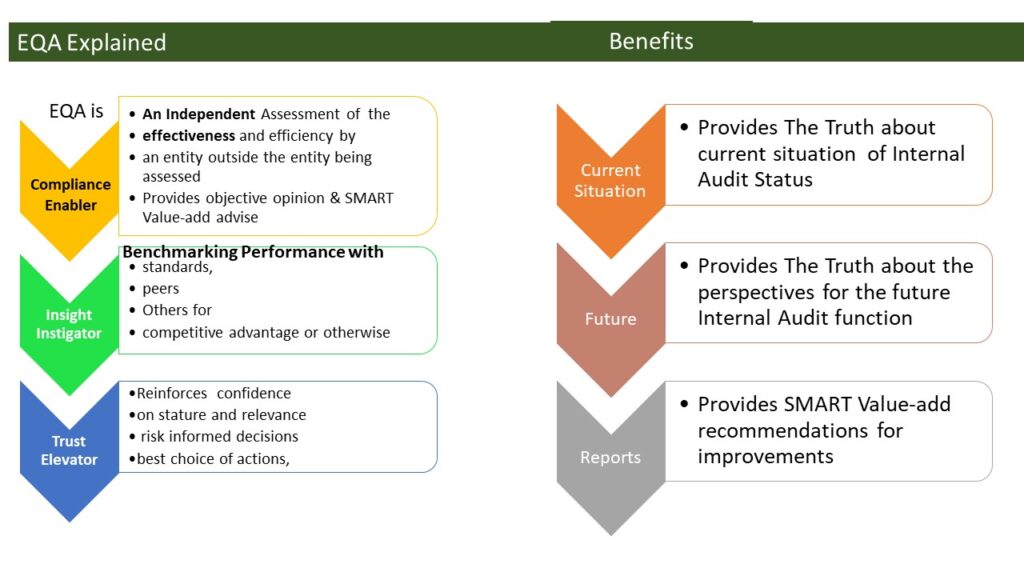 EQA simply means auditing the internal auditor and it is necessary to assess how well they are doing in fulfilling the Value Protection and Value Addition Mandates to their organizations and stakeholders.