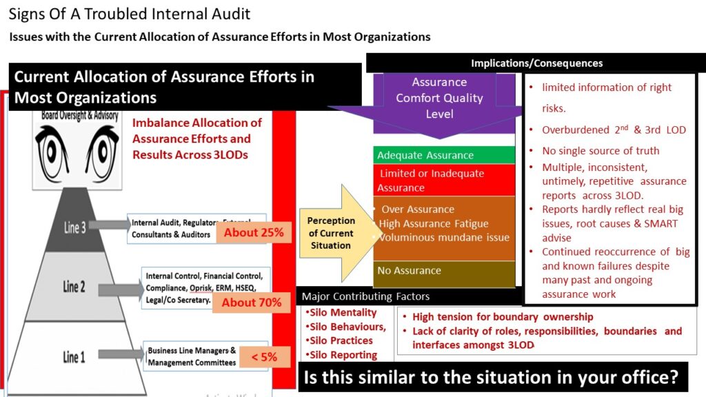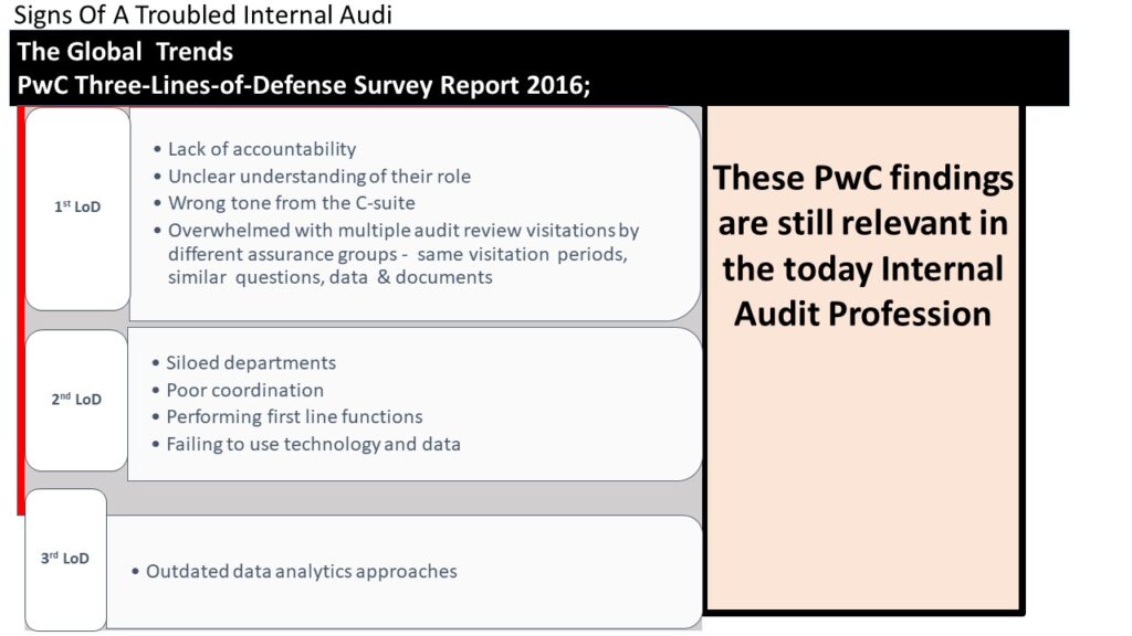 However, a large number of organizations in many jurisdictions are still struggling in delivering audit excellence. The root cause is mostly attributed to knowledge gap and limited funding. In such organizations the results of the PwC Global Survey of 2016 are still relevant today. These findings are clear indications of an underperforming internal audit function.